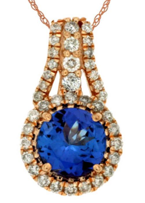 14KT ROSE GOLD FUN FLOATING PENDANT. 3D HALO TEAR DROP DESIGN. ROUND DIAMONDS ARE F/G COLOR, VSSI CLARITY .20 CARATS. AAA EXTRA FACETED TANZANITE IS .62 CARATS. COMES ON A 14KT GOLD DIAMOND CUT 18" INCH CHAIN. WRITTEN APPRAISAL AVAILABLE. COMES IN A PRESENTABLE GIFT BOX.