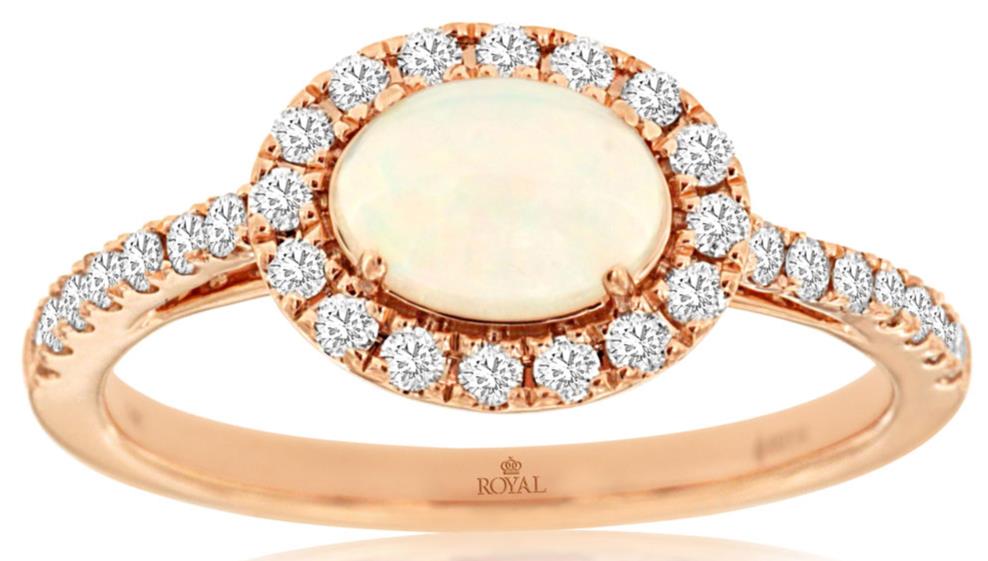 14KT ROSE GOLD FRIENDSHIP LOVE RING. 3D HALO DESIGN. ROUND DIAMONDS ARE F/G COLOR, VSSI CLARITY .33 CARATS. AAA OVAL OPAL IS .50 CARATS. RING SIZE 7. CAN BE SIZED BY OUR MASTER JEWELER UPON REQUEST. WRITTEN APPRAISAL AVAILABLE. COMES IN A PRESENTABLE GIFT BOX.