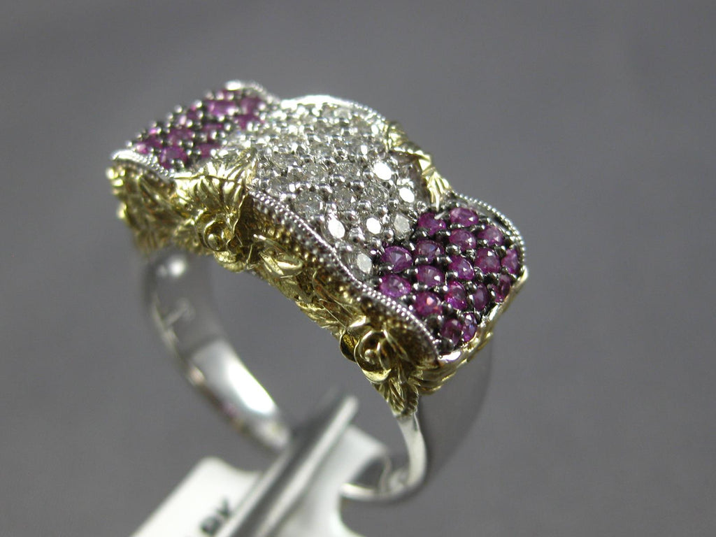 18KT WHITE AND YELLOW GOLD ANNIVERSARY RING. 3D MULTI ROW FILIGREE FLOWER DESIGN. ROUND DIAMONDS ARE F/G COLOR, VSSI CLARITY .38 CARATS. AAA ROUND PINK SAPPHIRES ARE .45 CARATS. MEASURES 10.4mm WIDE. RING SIZE 7. CAN BE SIZED BY OUR MASTER JEWELER UPON REQUEST. WRITTEN APPRAISAL AVAILABLE. COMES IN A PRESENTABLE GIFT BOX.