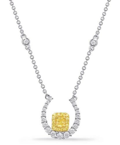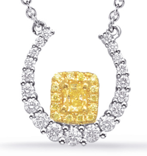 14KT WHITE AND YELLOW GOLD LOVE NECKLACE. 3D LUCKY HORSESHOE BY THE YARD DESIGN. ROUND DIAMONDS ARE F/G COLOR, VSSI CLARITY .48 CARATS. CUSHION CUT CANARY DIAMOND IS .35 CARATS. 18" INCHES LONG. WRITTEN APPRAISAL AVAILABLE. COMES IN A PRESENTABLE GIFT BOX.