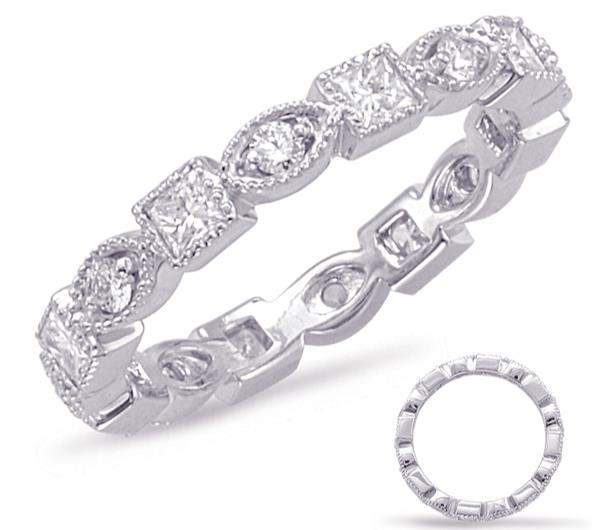 14KT WHITE GOLD ANNIVERSARY RING. 3D FILIGREE MILGRAIN ETERNITY DESIGN. DIAMONDS ARE F/G COLOR, VSSI CLARITY. ROUND DIAMONDS ARE .24 CARATS. PRINCESS CUT DIAMONDS ARE .60 CARATS. MEASURES 3mm WIDE. RING SIZE 6.75. CAN BE SIZED BY OUR MASTER JEWELER UPON REQUEST. WRITTEN APPRAISAL AVAILABLE. COMES IN A PRESENTABLE GIFT BOX.