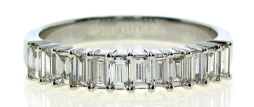 18KT WHITE GOLD ANNIVERSARY RING. 3D CLASSIC SHARED PRONG SEMI ETERNITY DESIGN. BAGUETTE DIAMONDS ARE F/G COLOR, VSSI CLARITY .84 CARATS. RING SIZE 7. CAN BE SIZED BY OUR MASTER JEWELER UPON REQUEST. WRITTEN APPRAISAL AVAILABLE. COMES IN A PRESENTABLE GIFT BOX.