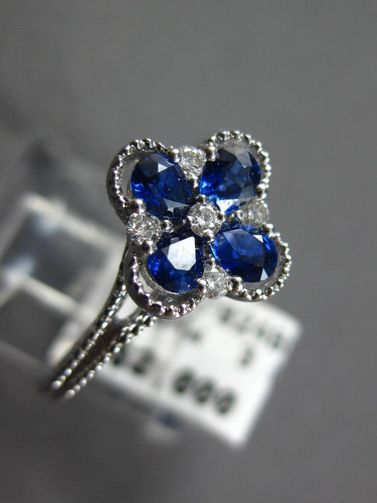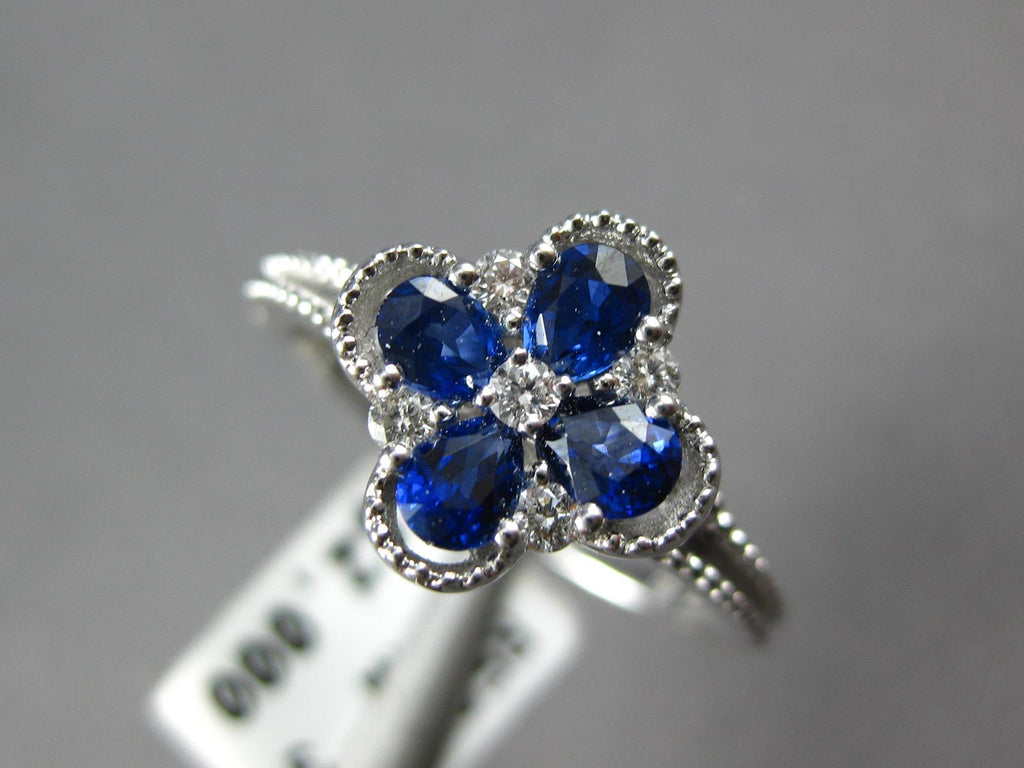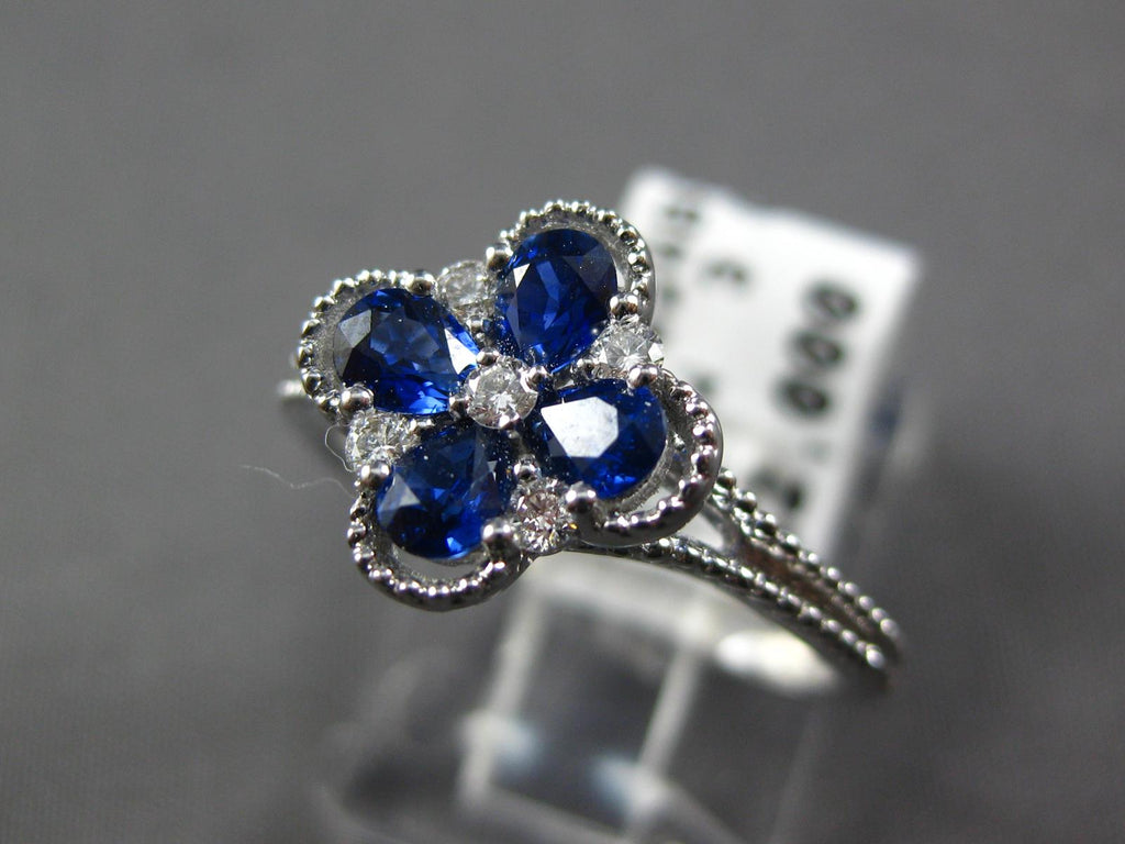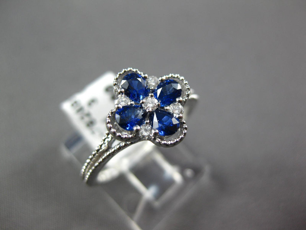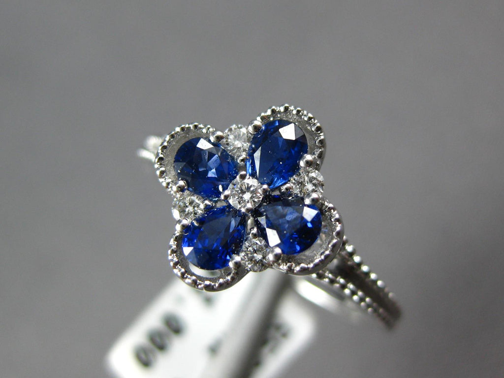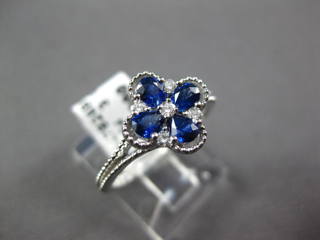 18KT WHITE GOLD LOVE RING. 3D FOUR LEAF CLOVER FLOWER DESIGN. ROUND DIAMONDS ARE F/G COLOR, VSSI CLARITY .11 CARATS. AAA PEAR SHAPE SAPPHIRES ARE .73 CARATS. MEASURES 10.5mm WIDE. RING SIZE 7. CAN BE SIZED BY OUR MASTER JEWELER UPON REQUEST. WRITTEN APPRAISAL AVAILABLE. COMES IN A PRESENTABLE GIFT BOX.