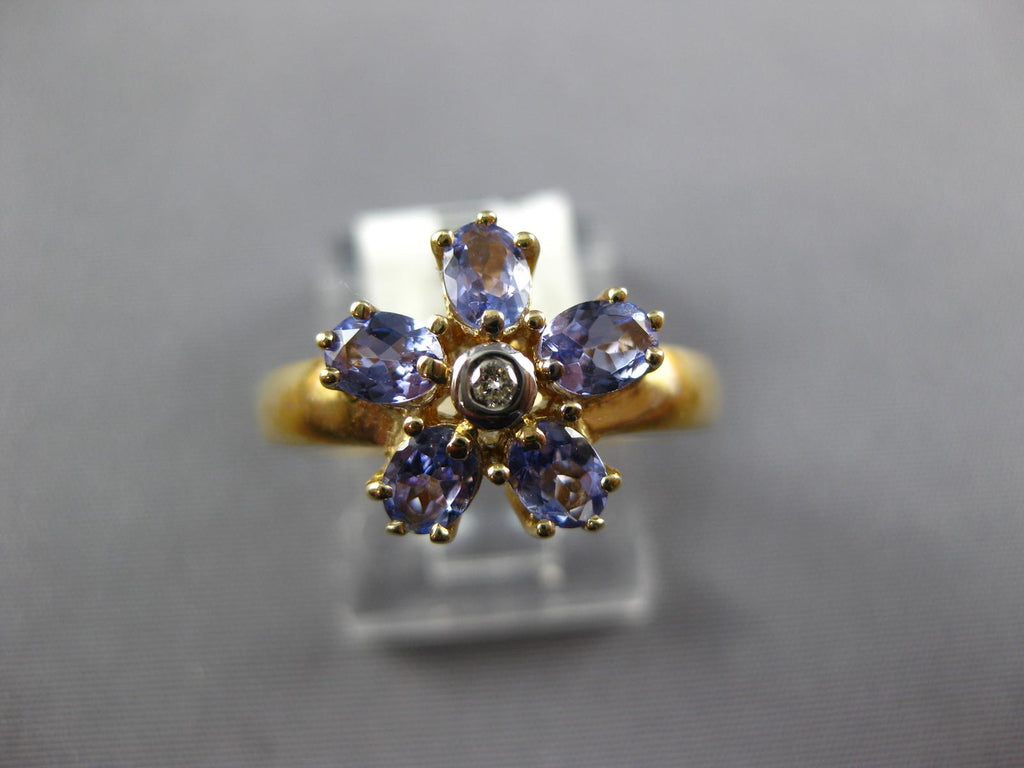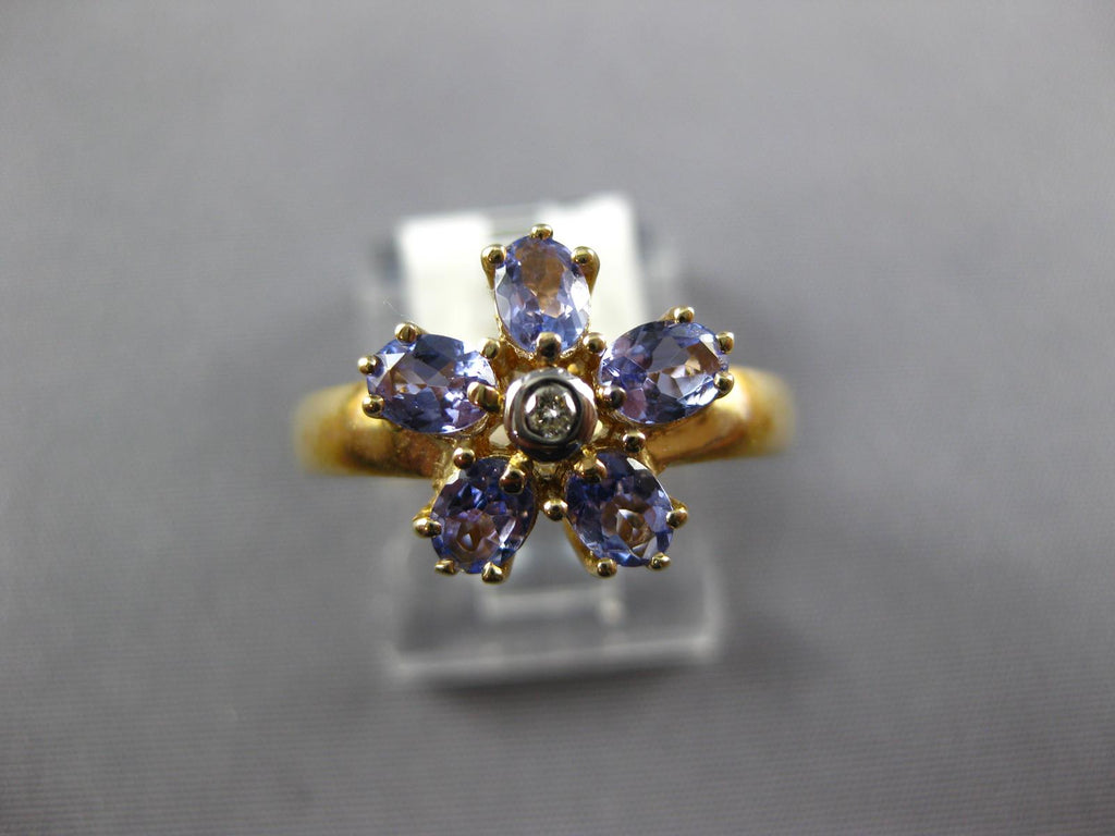 14KT YELLOW GOLD FUN RING. 3D FLOWER DESIGN. ROUND DIAMONDS ARE F/G COLOR, VSSI CLARITY .02 CARATS. AAA OVAL TANZANITES ARE .82 CARATS. MEASURES 11mm WIDE. RING SIZE 7. CAN BE SIZED BY OUR MASTER JEWELER UPON REQUEST. WRITTEN APPRAISAL AVAILABLE. COMES IN A PRESENTABLE GIFT BOX.