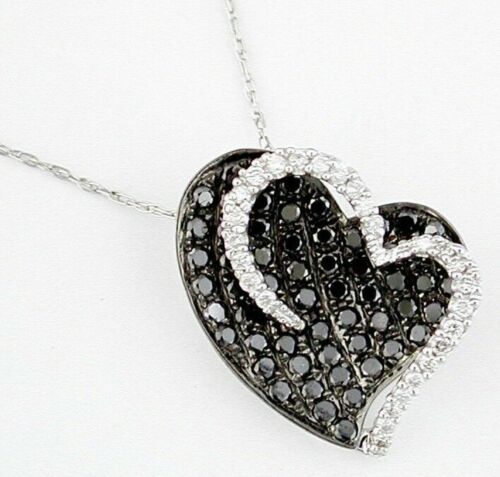 14KT WHITE GOLD LOVE PENDANT. 3D PAVE DOUBLE HEART DESIGN. WHITE DIAMONDS ARE F/G COLOR, VSSI CLARITY .14 CARATS. BLACK DIAMONDS ARE .70 CARATS. COMES ON A 14KT GOLD DIAMOND CUT 16" INCH CHAIN. WRITTEN APPRAISAL AVAILABLE. COMES IN A PRESENTABLE GIFT BOX.