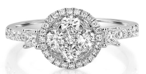 18KT WHITE GOLD FRIENDSHIP RING. 3D CLASSIC CLUSTER CIRCULAR DESIGN. DIAMONDS ARE F/G COLOR, VSSI CLARITY. ROUND DIAMONDS ARE .68 CARATS. PRINCESS CUT DIAMONDS ARE .17 CARATS. RING SIZE 7. CAN BE SIZED BY OUR MASTER JEWELER UPON REQUEST. WRITTEN APPRAISAL AVAILABLE. COMES IN A PRESENTABLE GIFT BOX.
