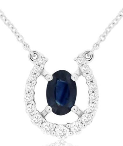 14KT WHITE GOLD FUN NECKLACE. 3D LUCKY HORSESHOE DESIGN. ROUND DIAMONDS ARE F/G COLOR, VSSI CLARITY .20 CARATS. AAA EXTRA FACETED OVAL SAPPHIRE IS .65 CARATS. 17" INCHES LONG. WRITTEN APPRAISAL AVAILABLE. COMES IN A PRESENTABLE GIFT BOX.