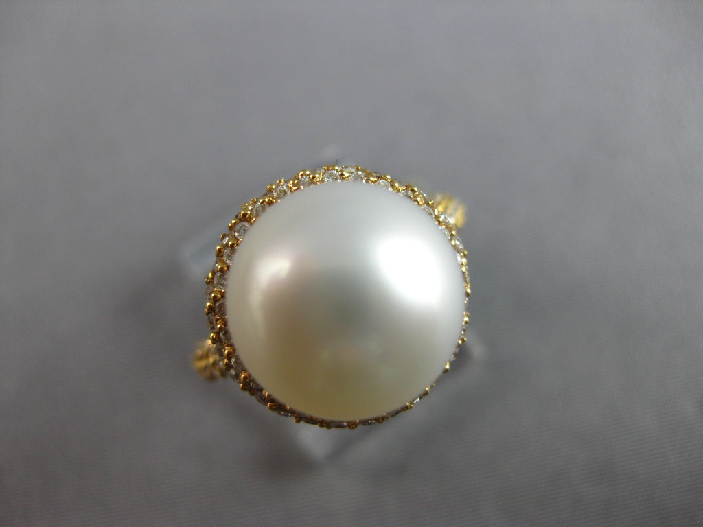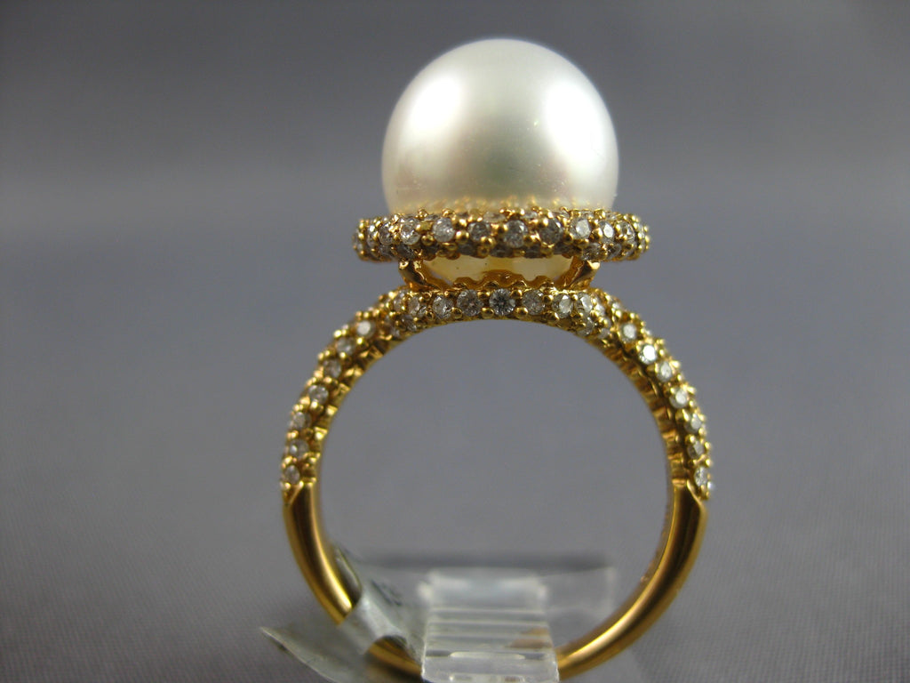 LARGE 18KT YELLOW GOLD FUN RING. 3D CLASSIC SOLITAIRE HALO DESIGN. ROUND DIAMONDS ARE F/G COLOR, VSSI CLARITY .85 CARATS. AAA SOUTH SEA PEARL IS 11mm WIDE. RING MEASURES 14mm WIDE. RING SIZE 7. CAN BE SIZED BY OUR MASTER JEWELER UPON REQUEST. WRITTEN APPRAISAL AVAILABLE. COMES IN A PRESENTABLE GIFT BOX.