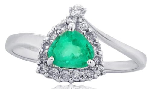 18KT WHITE GOLD ENGAGEMENT RING. 3D HALO CRISS CROSS DESIGN. ROUND DIAMONDS ARE F/G COLOR, VSSI CLARITY .25 CARATS. AAA TRILLION CUT EMERALD IS .61 CARATS. RING SIZE 7. CAN BE SIZED BY OUR MASTER JEWELER UPON REQUEST. WRITTEN APPRAISAL AVAILABLE. COMES IN A PRESENTABLE GIFT BOX.