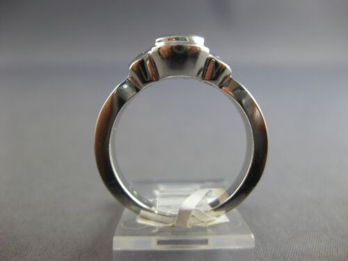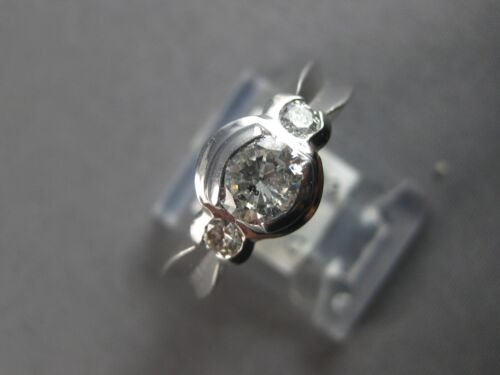14KT WHITE GOLD ENGAGEMENT RING. 3D CLASSIC SEMI BEZEL THREE STONE DESIGN. ROUND DIAMONDS ARE F/G COLOR, VSSI CLARITY. CENTER DIAMOND IS .65 CARATS. SIDE DIAMONDS ARE .22 CARATS. MEASURES 8mm WIDE. RING SIZE 6. CAN BE SIZED BY OUR MASTER JEWELER UPON REQUEST. WRITTEN APPRAISAL AVAILABLE. COMES IN A PRESENTABLE GIFT BOX.