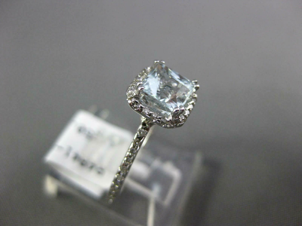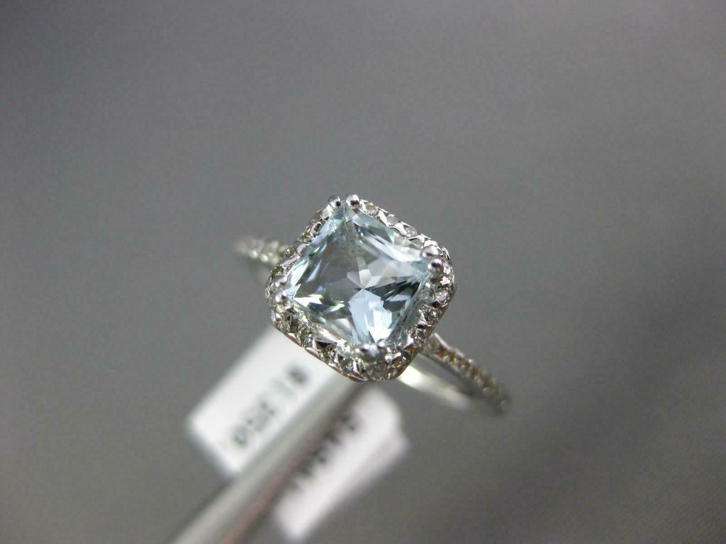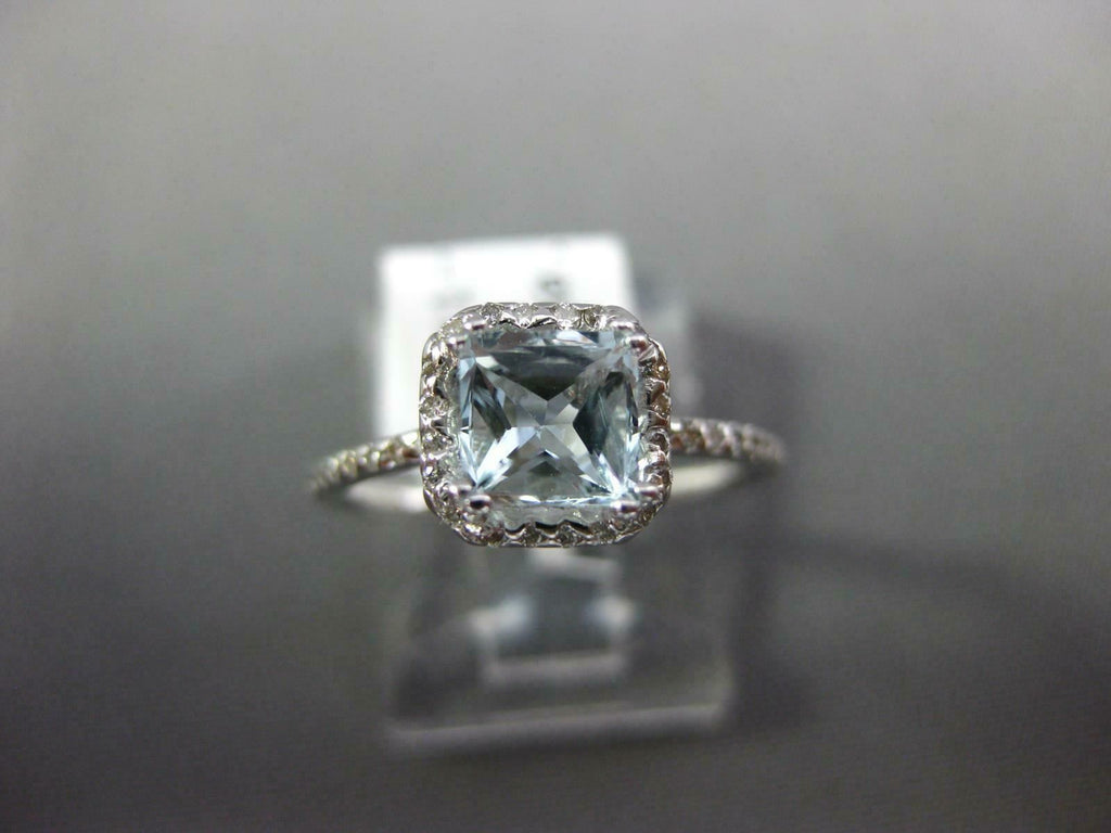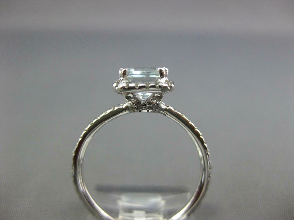 14KT WHITE GOLD ENGAGEMENT RING. 3D HALO CLASSIC DESIGN. DIAMONDS ARE F/G COLOR, VSSI CLARITY .27 CARATS. AAA EXTRA FACETED PRINCESS CUT AQUAMARINE IS .60 CARATS. MEASURES 7mm WIDE. RING SIZE 5.25. CAN BE SIZED BY OUR MASTER JEWELER UPON REQUEST. WRITTEN APPRAISAL AVAILABLE. COMES IN A PRESENTABLE GIFT BOX.