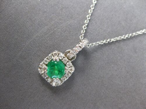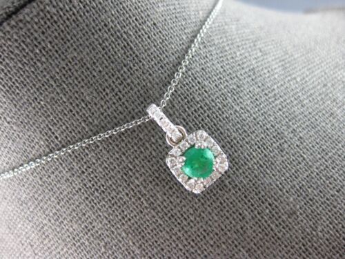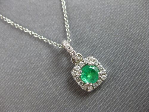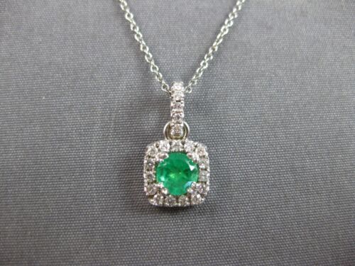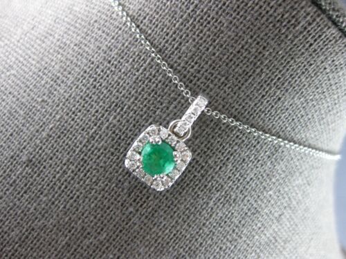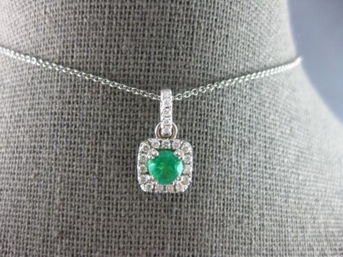 14KT WHITE GOLD FLOATING PENDANT. 3D CLASSIC SQUARE HALO DESIGN. ROUND DIAMONDS ARE F/G COLOR, VSSI CLARITY .27 CARATS. AAA EMERALD IS .60 CARATS. MEASURES 16mm X 9mm. COMES ON A 14KT GOLD DIAMOND CUT 16" INCH CHAIN. WRITTEN APPRAISAL AVAILABLE. COMES IN A PRESENTABLE GIFT BOX.