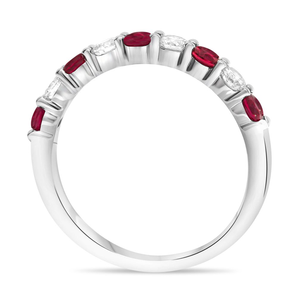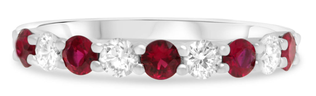 14KT WHITE GOLD  WEDDING ANNIVERSARY RING. 3D CLASSIC SEMI ETERNITY  DESIGN. ROUND DIAMONDS ARE F/G COLOR, VSSI CLARITY .34 CARATS. AAA ROUND RUBIES  ARE .54 CARATS.  MEASURES 2.25mm WIDE. RING SIZE 6.5. CAN BE SIZED BY OUR MASTER JEWELER UPON REQUEST. WRITTEN APPRAISAL AVAILABLE. COMES IN A PRESENTABLE GIFT BOX.