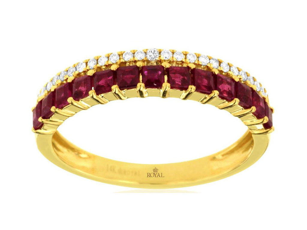 14KT YELLOW GOLD FUN RING. 3D TWO ROW SEMI ETERNITY DESIGN. ROUND DIAMONDS ARE F/G COLOR, VSSI CLARITY .09 CARATS. AAA PRINCESS CUT RUBIES ARE .79 CARATS. RING SIZE 7. CAN BE SIZED BY OUR MASTER JEWELER UPON REQUEST. WRITTEN APPRAISAL AVAILABLE. COMES IN A PRESENTABLE GIFT BOX.