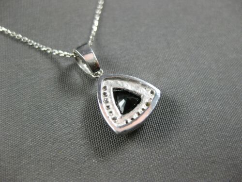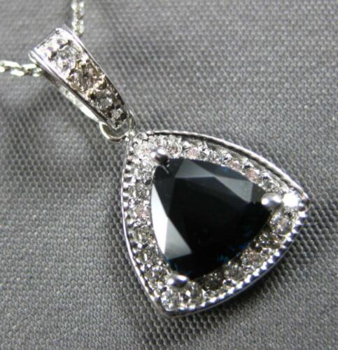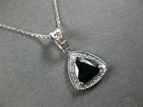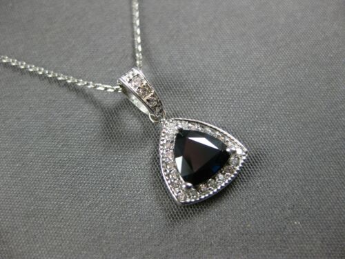 14KT WHITE GOLD FLOATING PENDANT. 3D CLASSIC HALO TRIANGULAR DESIGN. ROUND DIAMONDS ARE F/G COLOR, VSSI CLARITY .15 CARATS. AAA TRILLION CUT SAPPHIRE IS .73 CARATS. MEASURES 17mm X 10mm. COMES ON A 14KT GOLD DIAMOND CUT 16" INCH CHAIN. WRITTEN APPRAISAL AVAILABLE. COMES IN A PRESENTABLE GIFT BOX.