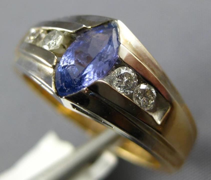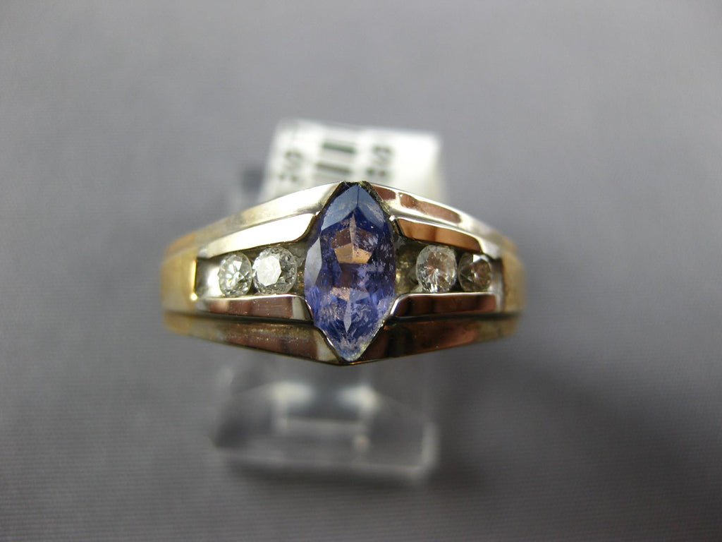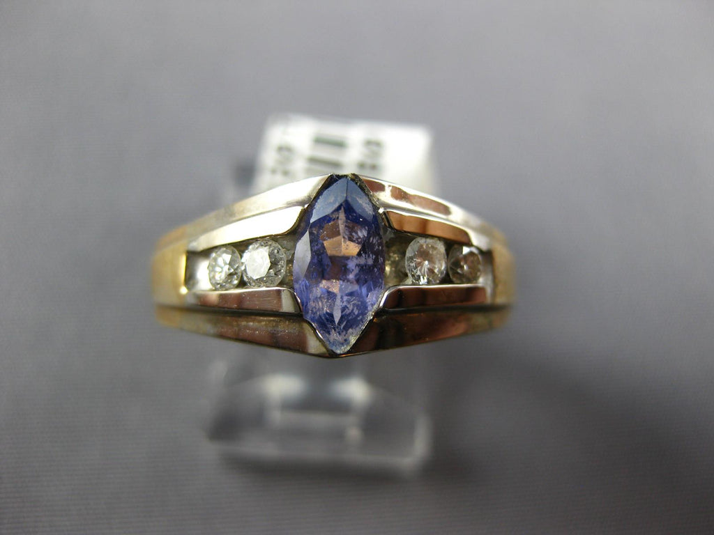 14KT YELLOW GOLD FUN RING. 3D BEZEL DESIGN. ROUND DIAMONDS ARE F/G COLOR, VSSI CLARITY .22 CARATS. AAA MARQUISE TANZANITE IS .66 CARATS. MEASURES 8mm WIDE. RING SIZE 7. CAN BE SIZED BY OUR MASTER JEWELER UPON REQUEST. WRITTEN APPRAISAL AVAILABLE. COMES IN A PRESENTABLE GIFT BOX.