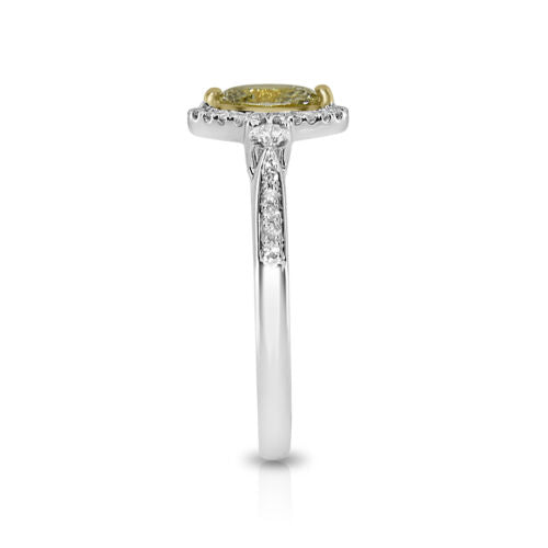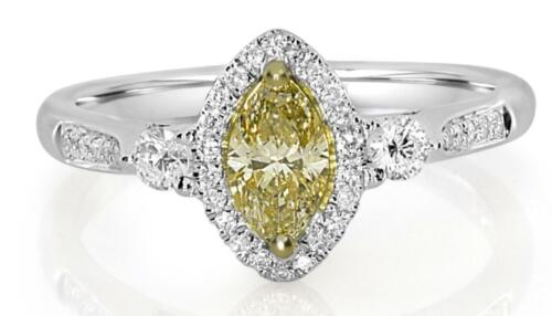 18KT WHITE AND YELLOW GOLD ENGAGEMENT RING. 3D HALO THREE STONE DESIGN. ROUND WHITE DIAMONDS ARE F/G COLOR, VSSI CLARITY .25 CARATS. MARQUISE FANCY YELLOW DIAMOND IS .63 CARATS. RING SIZE 7. CAN BE SIZED BY OUR MASTER JEWELER UPON REQUEST. WRITTEN APPRAISAL AVAILABLE. COMES IN A PRESENTABLE GIFT BOX.