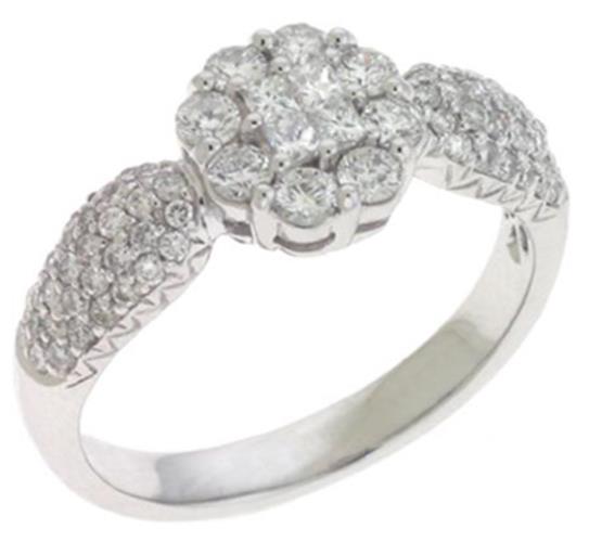 14KT WHITE GOLD FUN RING. 3D CLASSIC INVISIBLE FLOWER DESIGN. DIAMONDS ARE F/G COLOR, VSSI CLARITY. ROUND DIAMONDS ARE .76 CARATS. PRINCESS CUT DIAMONDS ARE .13 CARATS. MEASURES 8mm WIDE. RING SIZE 7. CAN BE SIZED BY OUR MASTER JEWELER UPON REQUEST. WRITTEN APPRAISAL AVAILABLE. COMES IN A PRESENTABLE GIFT BOX.