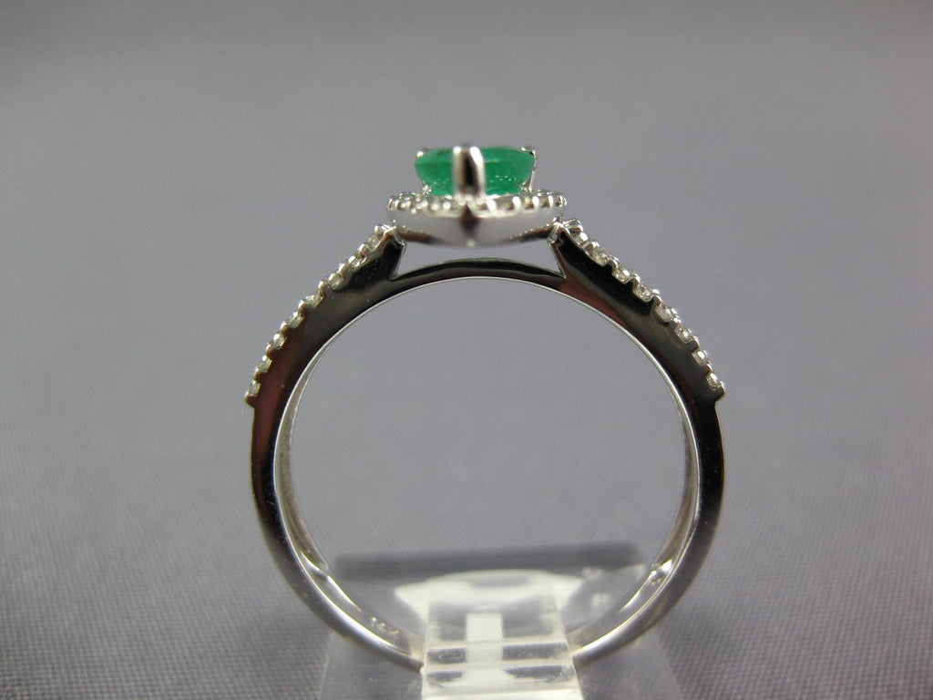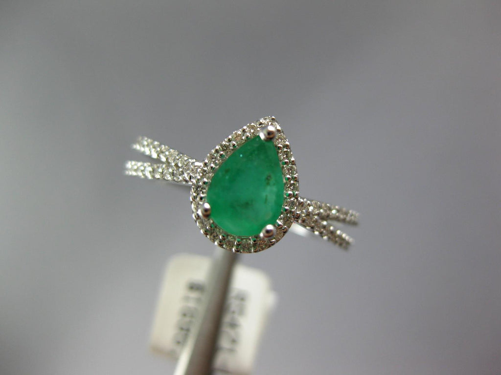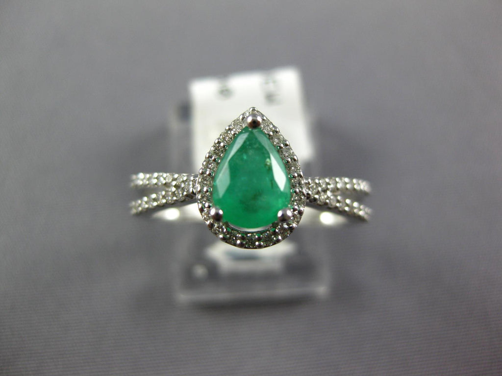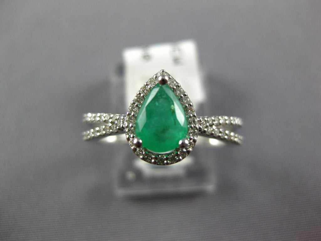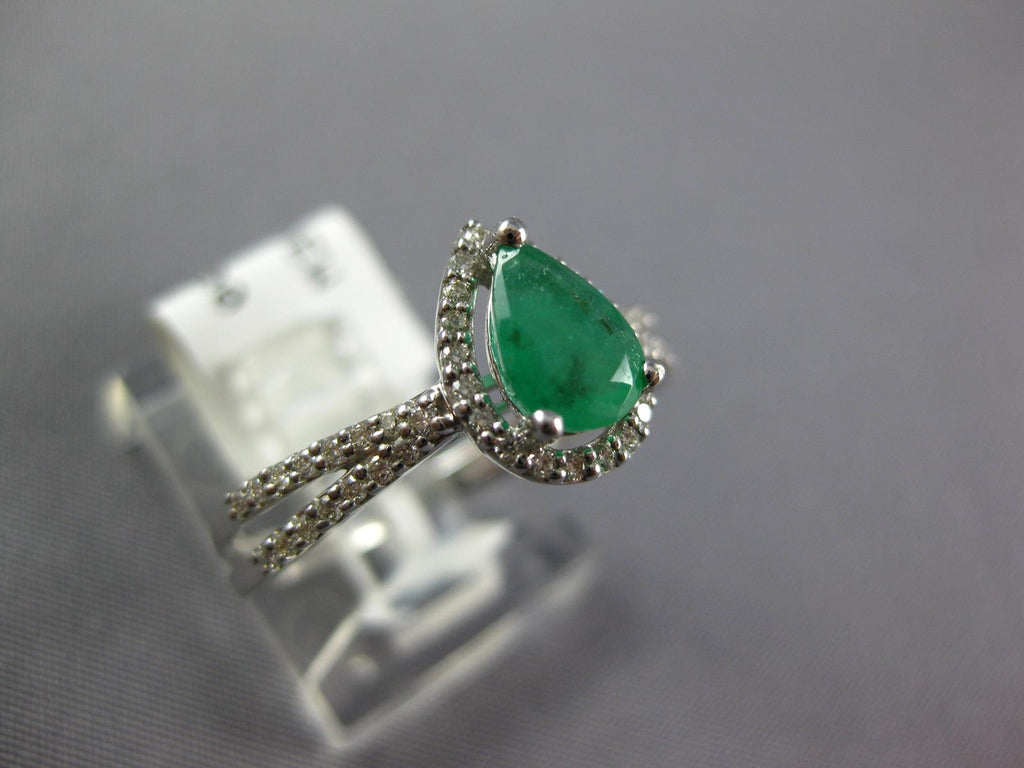 14KT WHITE GOLD LOVE RING. 3D CLASSIC HALO DESIGN. ROUND DIAMONDS ARE F/G COLOR, VSSI CLARITY .19 CARATS. AAA PEAR SHAPE EMERALD IS .70 CARATS. MEASURES 9.5mm WIDE. RING SIZE 7. CAN BE SIZED BY OUR MASTER JEWELER UPON REQUEST. WRITTEN APPRAISAL AVAILABLE. COMES IN A PRESENTABLE GIFT BOX.