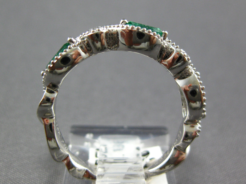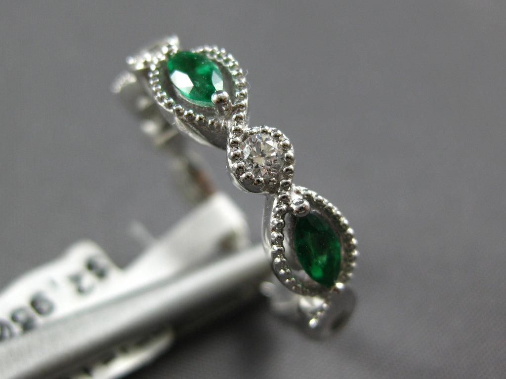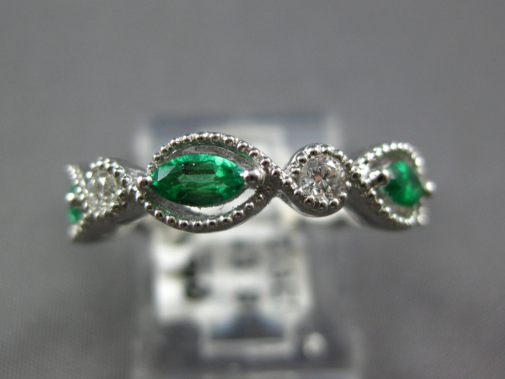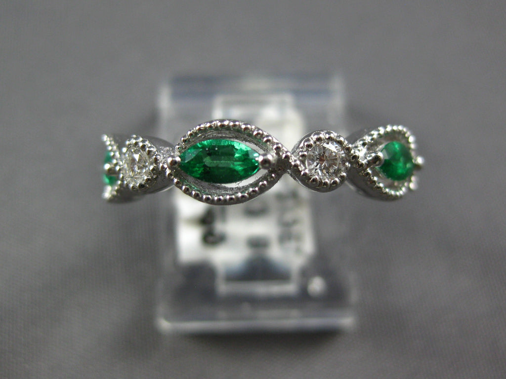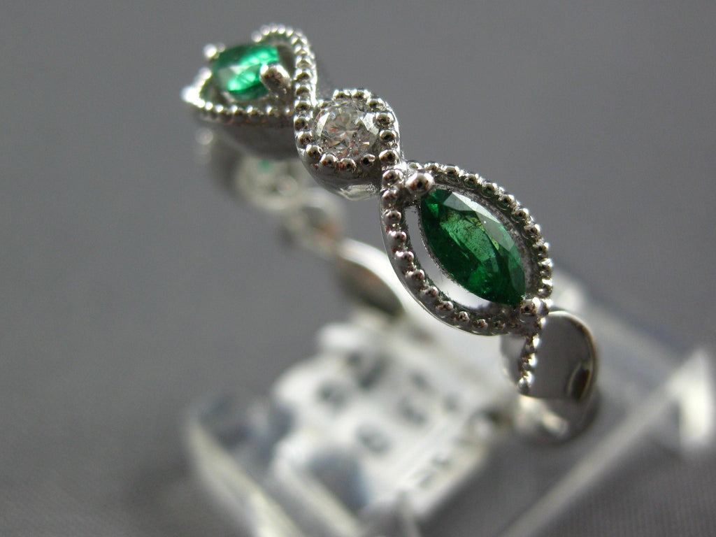 18KT WHITE GOLD FUN RING. 3D INFINITY DESIGN. ROUND DIAMONDS ARE F/G COLOR, VSSI CLARITY .11 CARATS. AAA MARQUISE EMERALDS ARE .78 CARATS. MEASURES 4.5mm WIDE. RING SIZE 6.25. CAN BE SIZED BY OUR MASTER JEWELER UPON REQUEST. WRITTEN APPRAISAL AVAILABLE. COMES IN A PRESENTABLE GIFT BOX.