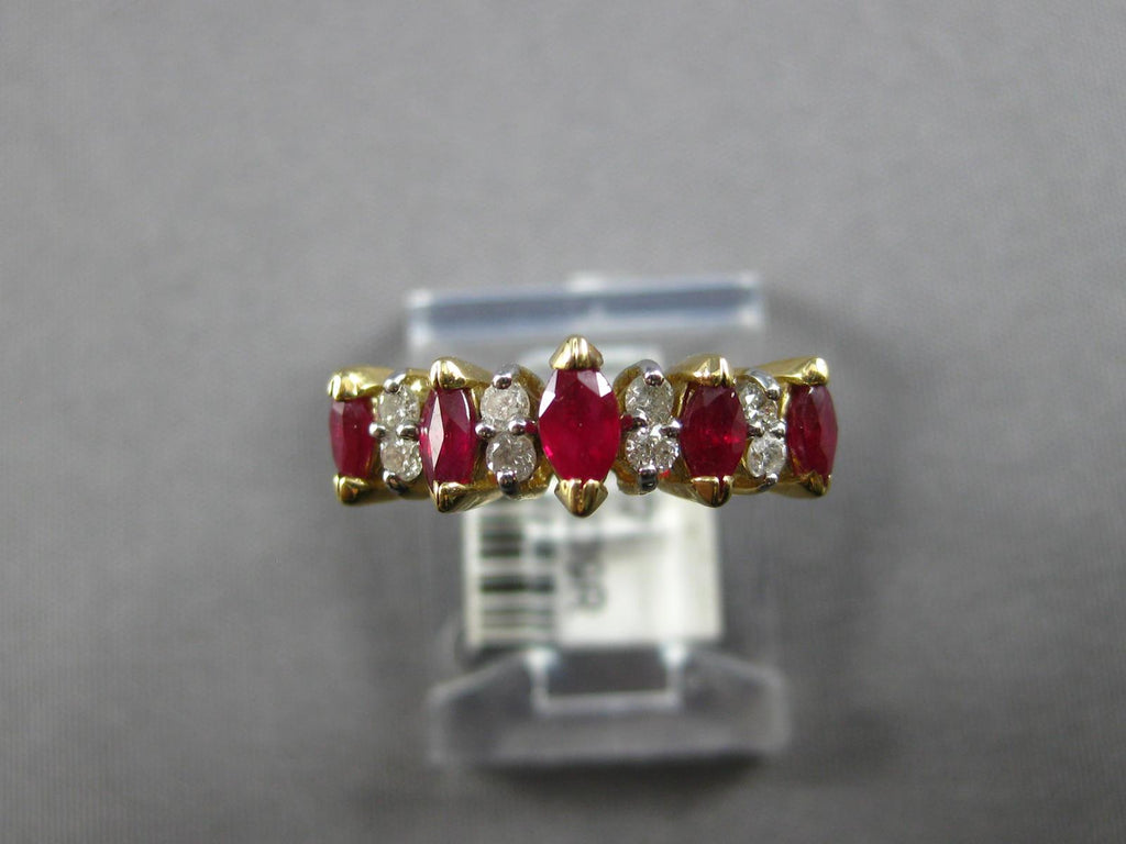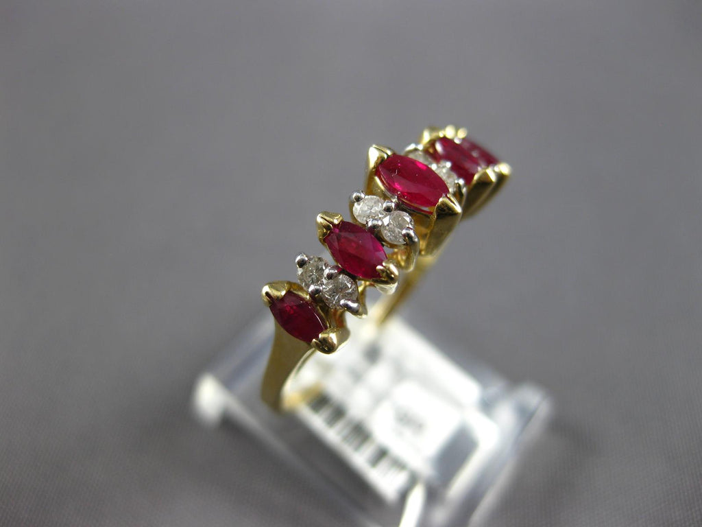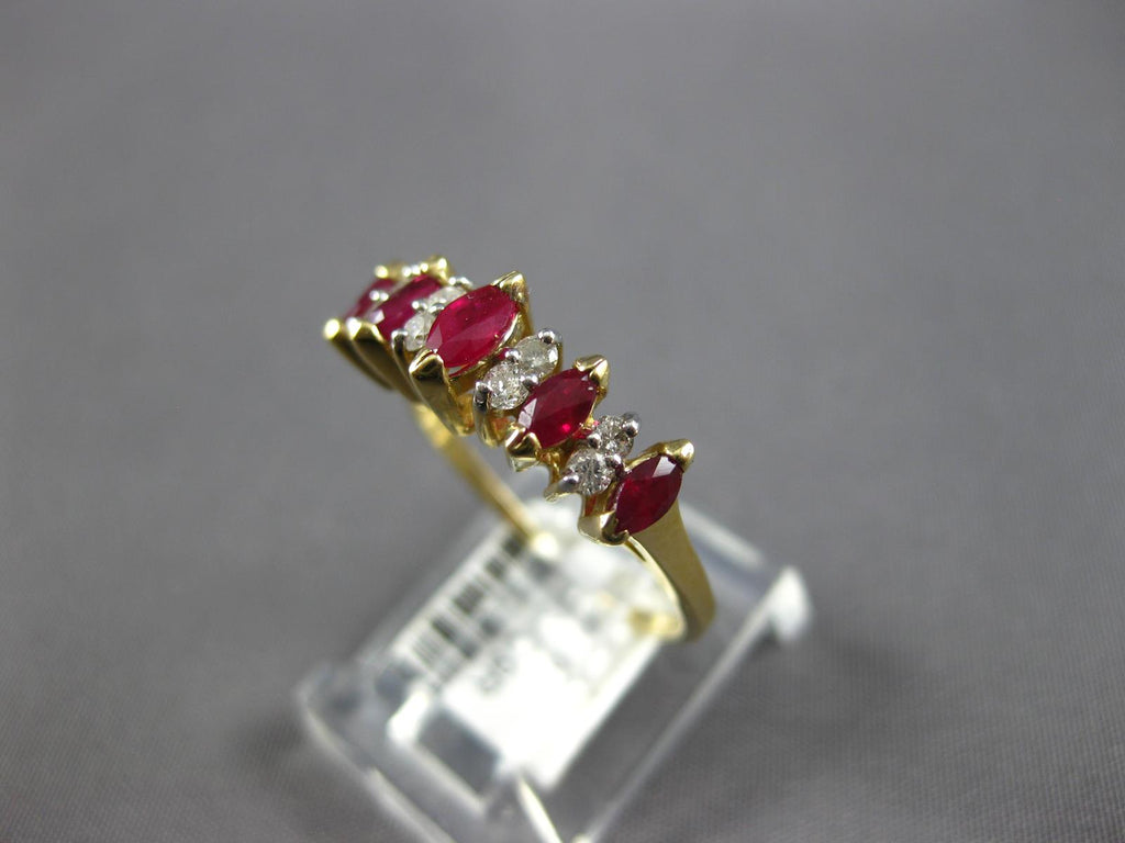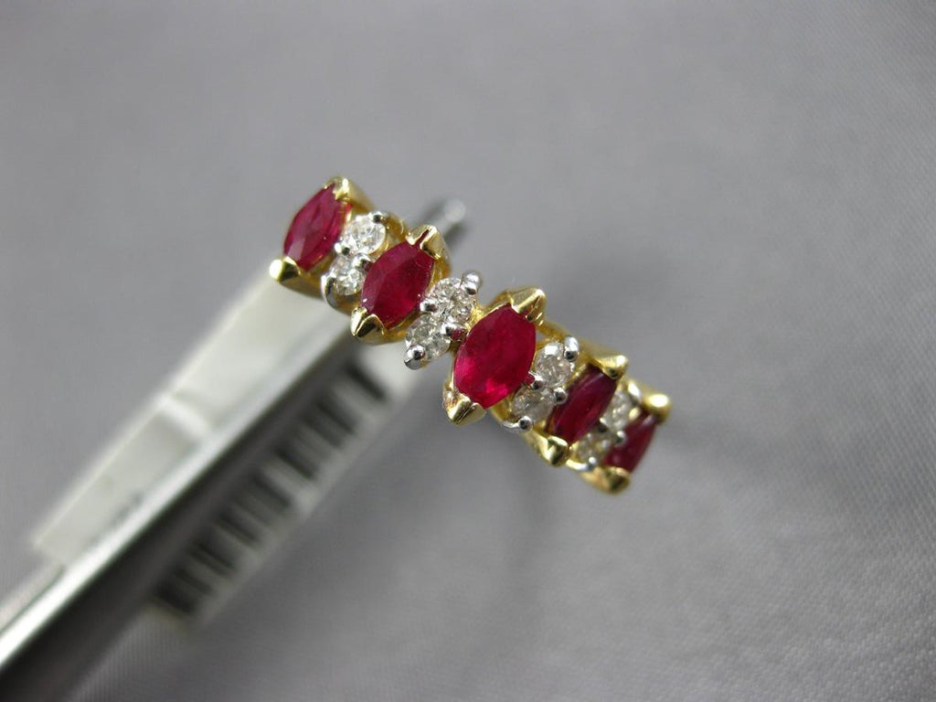 14KT YELLOW GOLD ANNIVERSARY RING. 3D CLASSIC DESIGN. ROUND DIAMONDS ARE F/G COLOR, VSSI CLARITY .14 CARATS. AAA MARQUISE RUBIES ARE .75 CARATS. MEASURES 4mm WIDE. RING SIZE 5.75. CAN BE SIZED BY OUR MASTER JEWELER UPON REQUEST. WRITTEN APPRAISAL AVAILABLE. COMES IN A PRESENTABLE GIFT BOX.