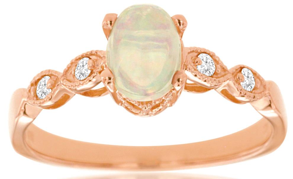 14KT ROSE GOLD ENGAGEMENT RING. 3D CLASSIC FILIGREE DESIGN. ROUND DIAMONDS ARE F/G COLOR, VSSI CLARITY .08 CARATS. AAA OVAL OPAL IS .50 CARATS. RING SIZE 7. CAN BE SIZED BY OUR MASTER JEWELER UPON REQUEST. WRITTEN APPRAISAL AVAILABLE. COMES IN A PRESENTABLE GIFT BOX.