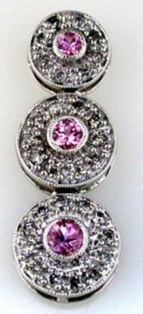 ESTATE 14KT WHITE GOLD PENDANT. 3D HALO JOURNEY DESIGN. DIAMONDS ARE F/G COLOR, VSSI CLARITY .33 CARATS. AAA ROUND PINK SAPPHIRES ARE .55 CARATS. COMES ON A 14KT GOLD DIAMOND CUT 16" INCH CHAIN. WRITTEN APPRAISAL AVAILABLE. COMES IN A PRESENTABLE GIFT BOX.