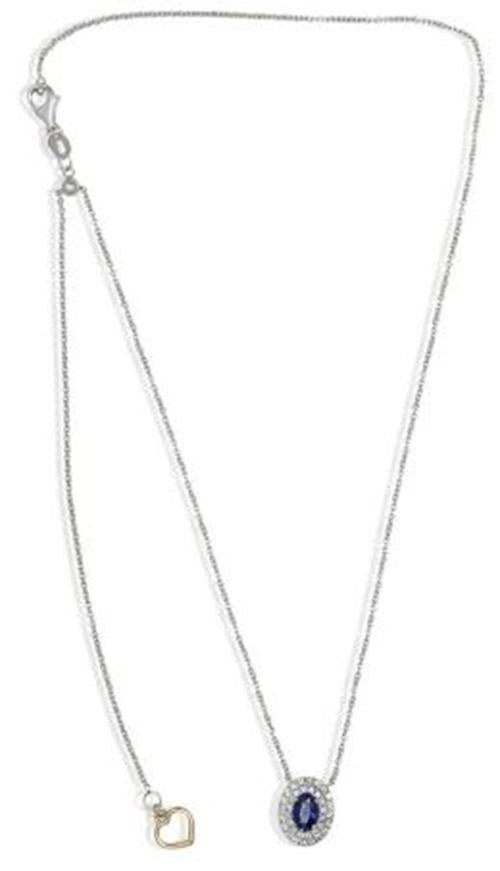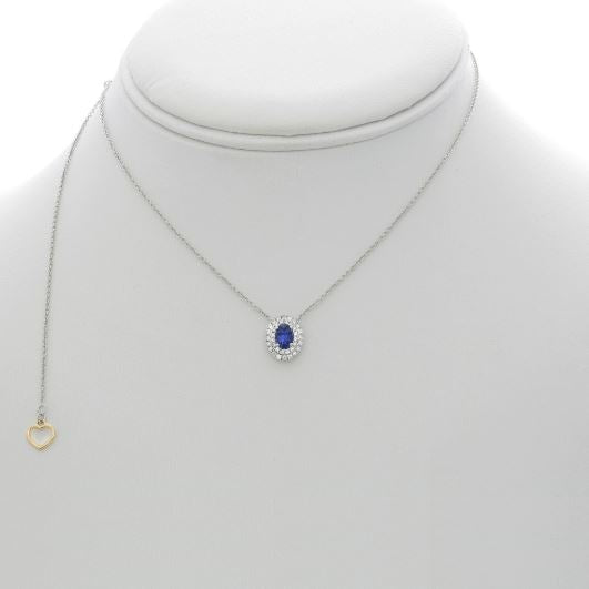 18KT WHITE GOLD LOVE NECKLACE. 3D DOUBLE HALO DESIGN. ROUND DIAMONDS ARE F/G COLOR, VSSI CLARITY .23 CARATS. AAA OVAL SAPPHIRE IS .45 CARATS. MEASURES 10.8mm X 8.6mm. 16" INCHES LONG. WRITTEN APPRAISAL AVAILABLE. COMES IN A PRESENTABLE GIFT BOX.