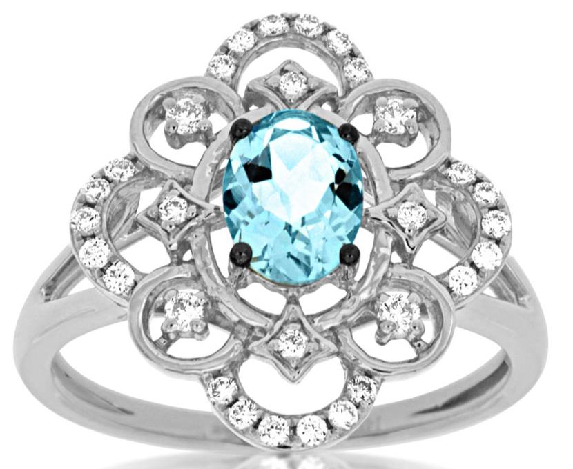 14KT WHITE GOLD FUN RING. 3D OPEN FILIGREE FLOWER DESIGN. ROUND DIAMONDS ARE F/G COLOR, VSSI CLARITY .22 CARATS. AAA EXTRA FACETED OVAL AQUAMARINE IS .68 CARATS. RING SIZE 7. CAN BE SIZED BY OUR MASTER JEWELER UPON REQUEST. WRITTEN APPRAISAL AVAILABLE. COMES IN A PRESENTABLE GIFT BOX.