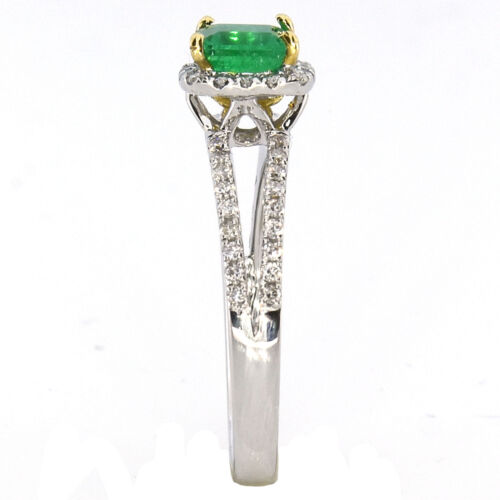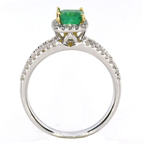 18KT WHITE AND YELLOW GOLD ENGAGEMENT RING. 3D HALO SPLIT SHANK DESIGN. ROUND WHITE DIAMONDS ARE F/G COLOR, VSSI CLARITY .29 CARATS. AAA SQUARE EMERALD IS .61 CARATS. RING SIZE 7. CAN BE SIZED BY OUR MASTER JEWELER UPON REQUEST. WRITTEN APPRAISAL AVAILABLE. COMES IN A PRESENTABLE GIFT BOX.