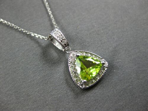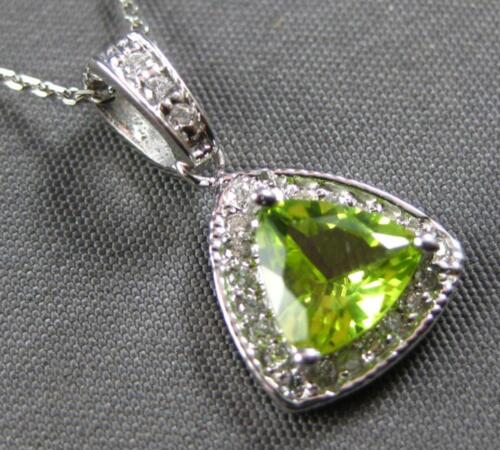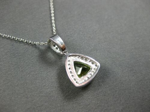 14KT WHITE GOLD FLOATING PENDANT. 3D CLASSIC HALO DESIGN. ROUND DIAMONDS ARE F/G COLOR, VSSI CLARITY .15 CARATS. AAA EXTRA FACETED TRILLION CUT PERIODT IS .75 CARATS. MEASURES 17mm X 9mm. COMES ON A 14KT GOLD DIAMOND CUT 16" INCH CHAIN. WRITTEN APPRAISAL AVAILABLE. COMES IN A PRESENTABLE GIFT BOX.