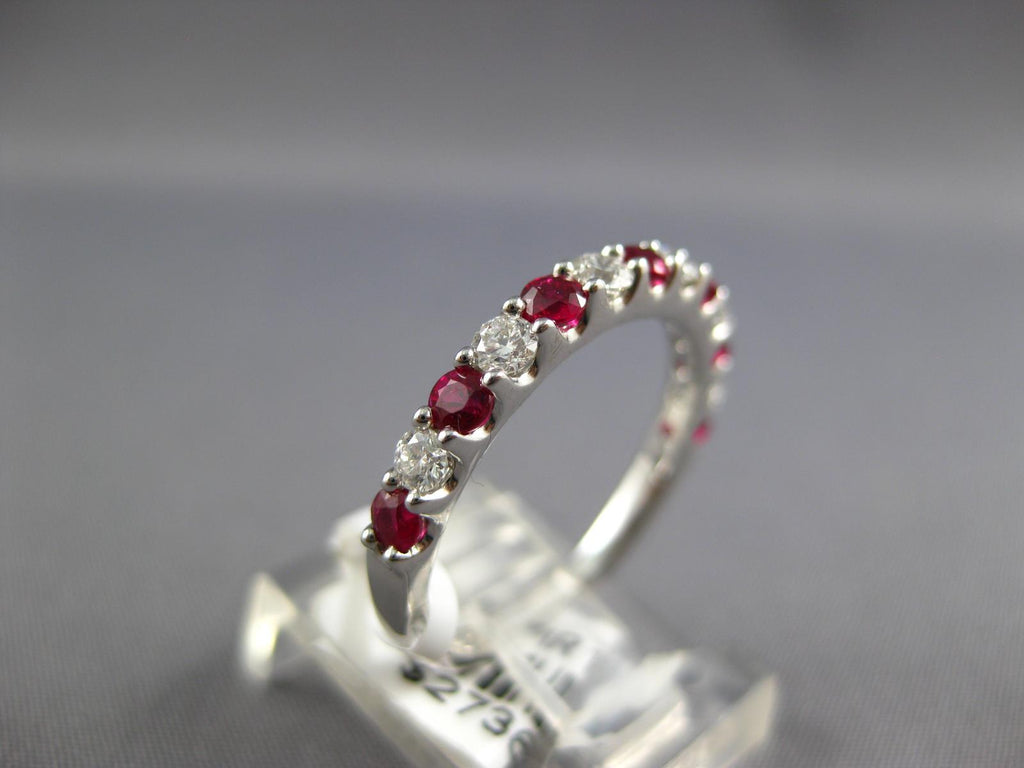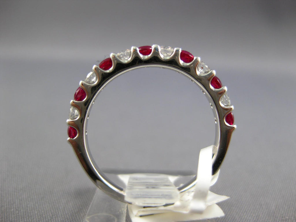 18KT WHITE GOLD ANNIVERSARY RING. 3D CLASSIC SHARE PRONG DESIGN. DIAMONDS ARE F/G COLOR, VSSI CLARITY .33 CARATS. AAA RUBIES ARE .57 CARATS. MEASURES 2mm WIDE. RING SIZE 6.5. CAN BE SIZED BY OUR MASTER JEWELER UPON REQUEST. WRITTEN APPRAISAL AVAILABLE. COMES IN A PRESENTABLE GIFT BOX.
