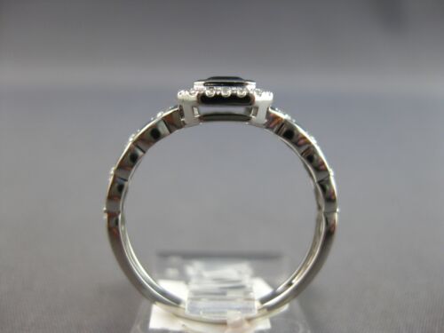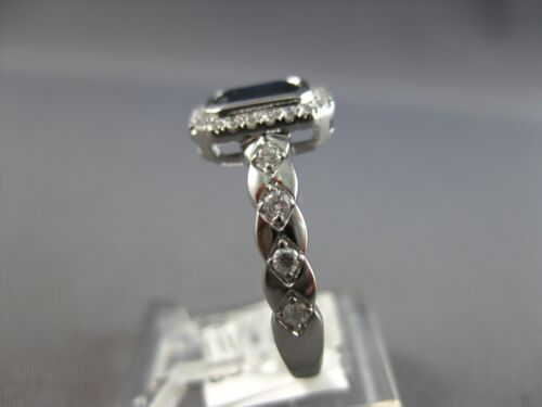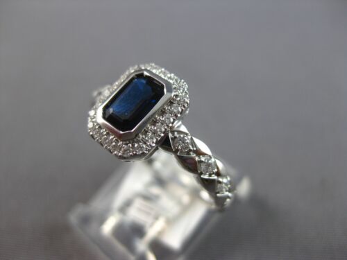 14KT WHITE GOLD ENGAGEMENT RING. 3D OCTAGON DESIGN. ROUND DIAMONDS ARE F/G COLOR, VSSI CLARITY .25 CARATS. AAA EMERALD CUT SAPPHIRE IS .65 CARATS. MEASURES 10mm WIDE. RING SIZE 7. CAN BE SIZED BY OUR MASTER JEWELER UPON REQUEST. WRITTEN APPRAISAL AVAILABLE. COMES IN A PRESENTABLE GIFT BOX.