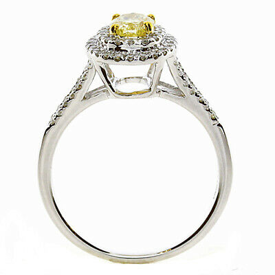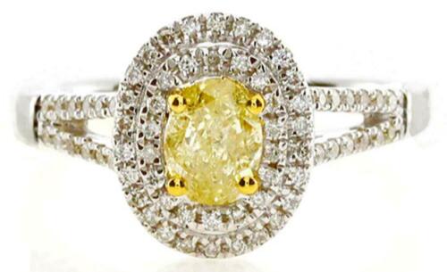18KT WHITE AND YELLOW GOLD ENGAGEMENT RING. 3D DOUBLE HALO DESIGN. ROUND WHITE DIAMONDS ARE F/G COLOR, VSSI CLARITY .29 CARATS. OVAL FANCY YELLOW DIAMOND IS .61 CARATS. RING SIZE 7. CAN BE SIZED BY OUR MASTER JEWELER UPON REQUEST. WRITTEN APPRAISAL AVAILABLE. COMES IN A PRESENTABLE GIFT BOX.