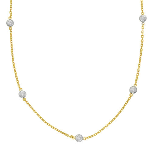 14KT WHITE AND YELLOW GOLD LOVE NECKLACE. 3D CLASSIC BY THE YARD BEZEL DESIGN. ROUND DIAMONDS ARE F/G COLOR, VSSI CLARITY .91 CARATS. MEASURES 4mm WIDE. 18" INCHES LONG. WRITTEN APPRAISAL AVAILABLE. COMES IN A PRESENTABLE GIFT BOX.
