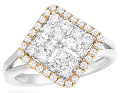 18KT WHITE AND YELLOW GOLD FUN RING. 3D MULTI FLOWER SQUARE HALO GEOMETRICAL DESIGN. DIAMONDS ARE F/G COLOR, VSSI CLARITY .91 CARATS. RING SIZE 7. CAN BE SIZED BY OUR MASTER JEWELER UPON REQUEST. WRITTEN APPRAISAL AVAILABLE. COMES IN A PRESENTABLE GIFT BOX.
