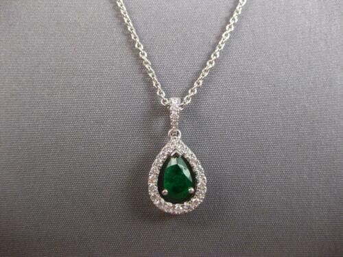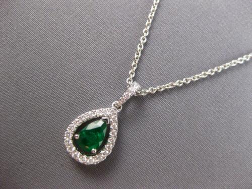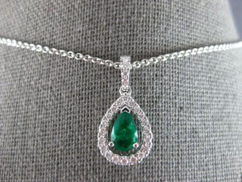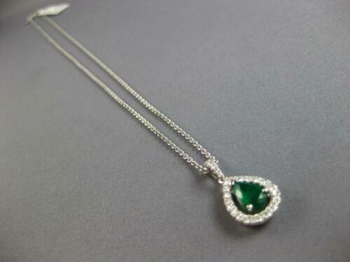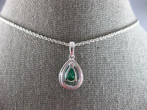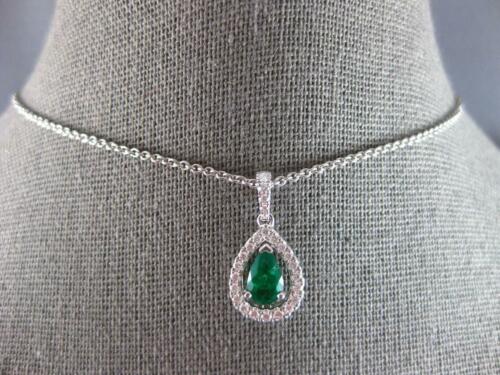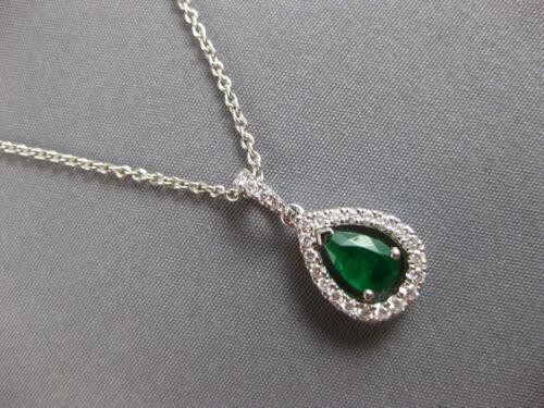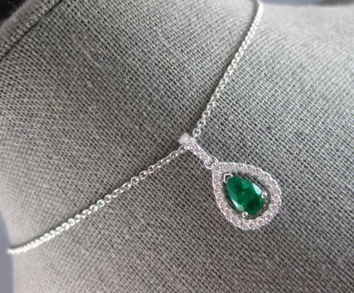 18KT WHITE GOLD FLOATING PENDANT. 3D CLASSIC HALO TEAR DROP DESIGN. ROUND DIAMONDS ARE F/G COLOR, VVS-VS CLARITY .28 CARATS. AAA PEAR SHAPE EMERALD IS .63 CARATS. EMERALD MEASURES 8mm X 5mm. PENDANT MEASURES 21mm X 10.5mm. COMES ON A 14KT GOLD DIAMOND CUT 18" INCH CHAIN. WRITTEN APPRAISAL AVAILABLE. COMES IN A PRESENTABLE GIFT BOX.