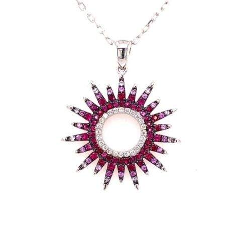 .91CT DIAMOND & AAA RUBY & PINK SAPPHIRE 18KT WHITE GOLD 3D SUNBURST FUN PENDANT