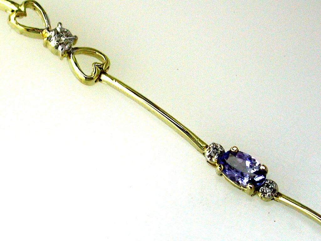 14KT YELLOW GOLD LOVE TENNIS BRACELET. 3D THREE STONE MULTI HEART DESIGN. DIAMONDS ARE F/G COLOR, VSSI CLARITY .06 CARATS. AAA TANZANITE IS .85 CARATS. 7" INCHES LONG. WRITTEN APPRAISAL AVAILABLE. COMES IN A PRESENTABLE GIFT BOX.