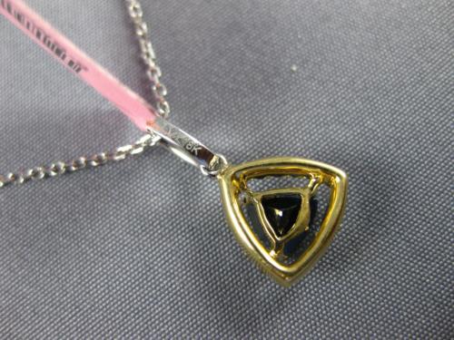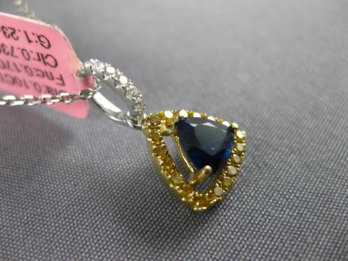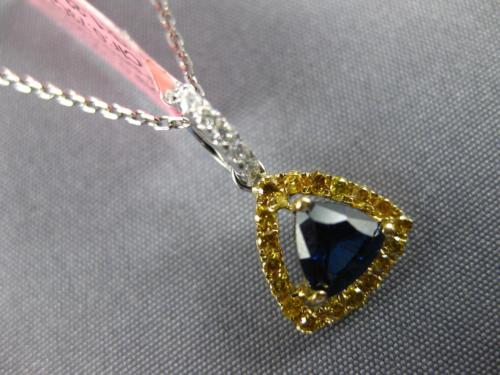 18KT WHITE AND YELLOW GOLD FLOATING PENDANT. 3D TRILLION CLASSIC DESIGN. WHITE DIAMONDS ARE F/G COLOR, VSSI CLARITY .10 CARATS. FANCY YELLOW DIAMONDS ARE .17 CARATS. AAA SAPPHIRE IS .73 CARATS. MEASURES 17mm X 9mm. COMES ON A 14KT GOLD DIAMOND CUT 16" INCH CHAIN. WRITTEN APPRAISAL AVAILABLE. COMES IN A PRESENTABLE GIFT BOX.