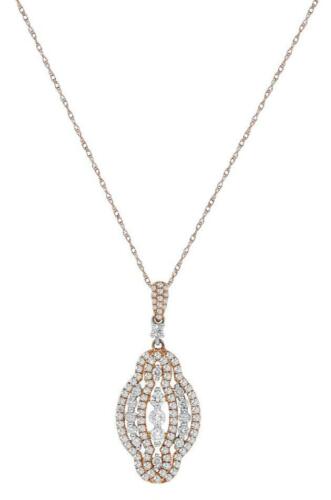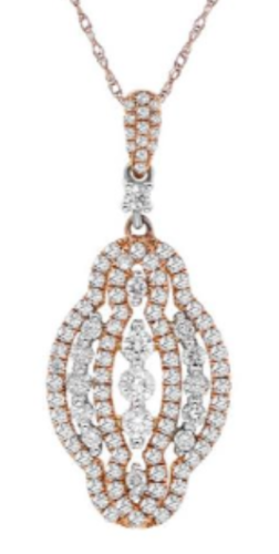 18KT WHITE AND ROSE GOLD FUN FLOATING PENDANT. 3D ELONGATED FLOWER DESIGN. DIAMONDS ARE F/G COLOR, VSSI CLARITY .92 CARATS. COMES ON A 14KT GOLD DIAMOND CUT 16" INCH CHAIN. WRITTEN APPRAISAL AVAILABLE. COMES IN A PRESENTABLE GIFT BOX.