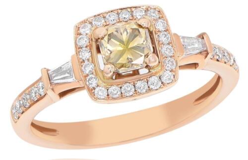 18KT ROSE GOLD ENGAGEMENT RING. 3D SQUARE HALO DESIGN. ROUND AND BAGUETTE DIAMONDS ARE F/G COLOR, VSSI CLARITY .37 CARATS. CUSHION CUT FANCY YELLOW DIAMOND IS .55 CARATS. RING SIZE 7. CAN BE SIZED BY OUR MASTER JEWELER UPON REQUEST. WRITTEN APPRAISAL AVAILABLE. COMES IN A PRESENTABLE GIFT BOX.