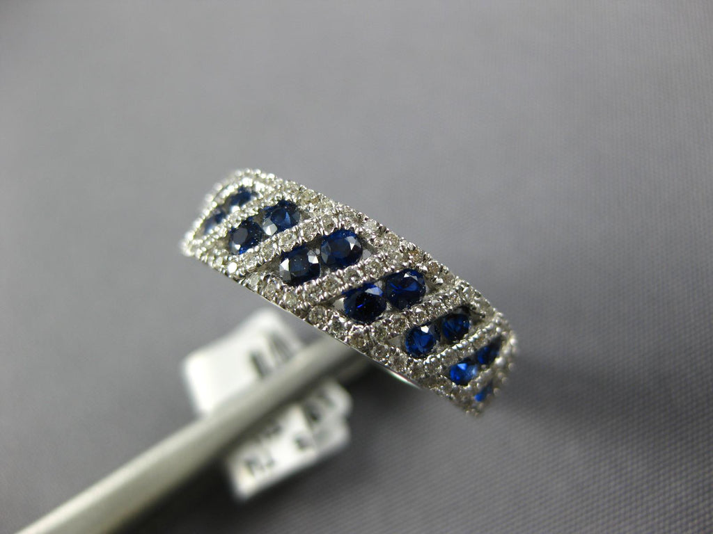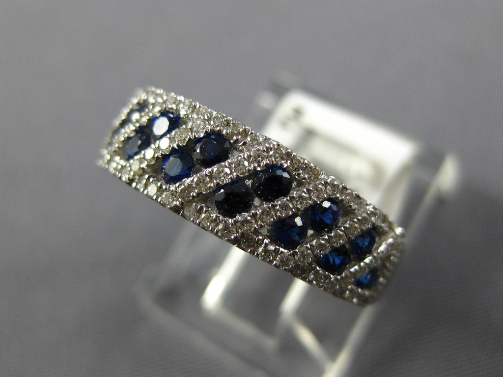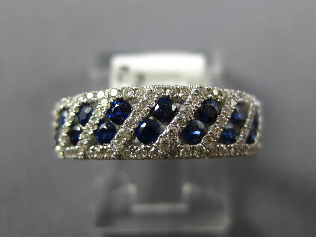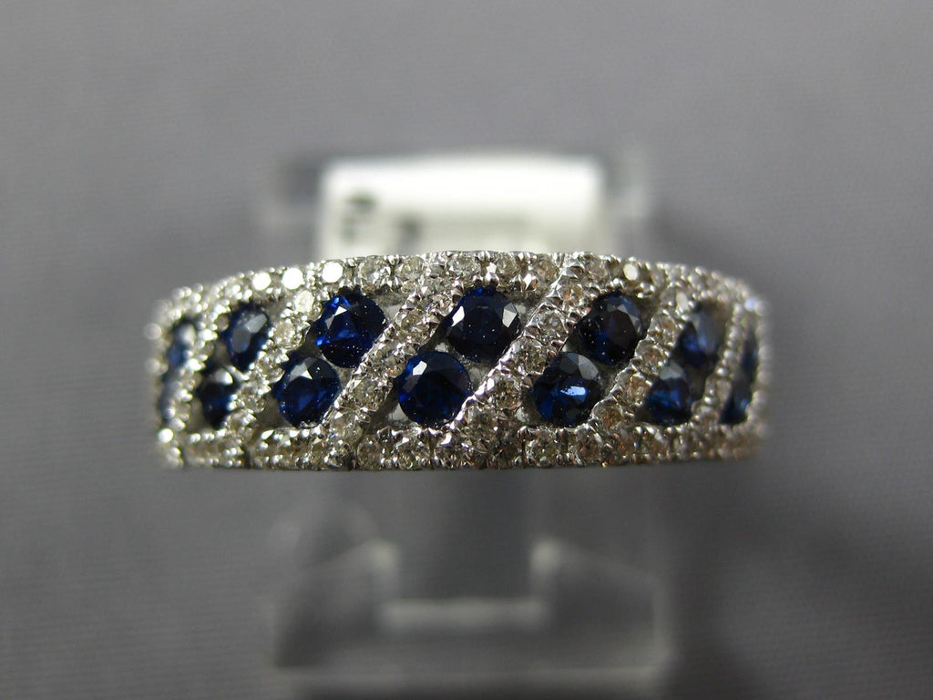 18KT WHITE GOLD ANNIVERSARY RING. 3D TWO ROW DIAGONAL DESIGN. DIAMONDS ARE F/G COLOR, VSSI CLARITY .35 CARATS. AAA ROUND SAPPHIRES ARE .58 CARATS. MEASURES 5mm WIDE. RING SIZE 6.5. CAN BE SIZED BY OUR MASTER JEWELER UPON REQUEST. WRITTEN APPRAISAL AVAILABLE. COMES IN A PRESENTABLE GIFT BOX.