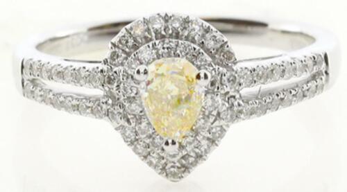 18KT WHITE GOLD ENGAGEMENT RING. 3D DOUBLE HALO DESIGN. ROUND DIAMONDS ARE F/G COLOR, VSSI CLARITY .40 CARATS. PEAR SHAPE FANCY YELLOW DIAMOND IS .53 CARATS. RING SIZE 7. CAN BE SIZED BY OUR MASTER JEWELER UPON REQUEST. WRITTEN APPRAISAL AVAILABLE. COMES IN A PRESENTABLE GIFT BOX.