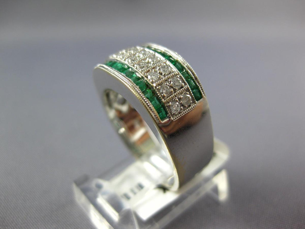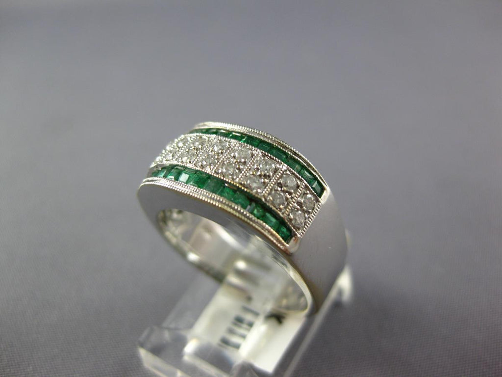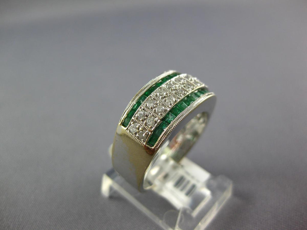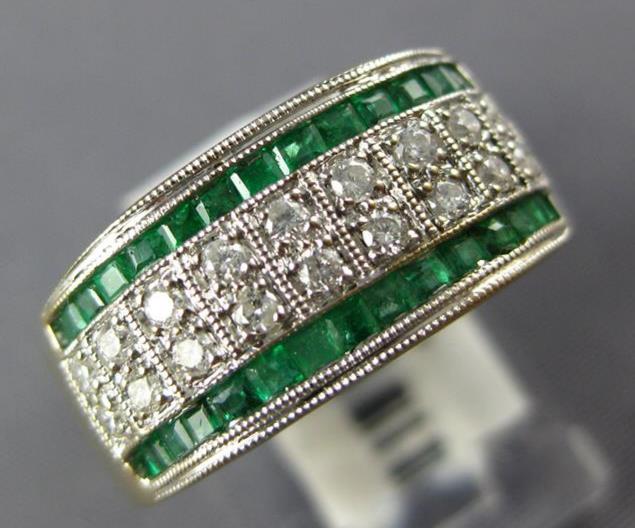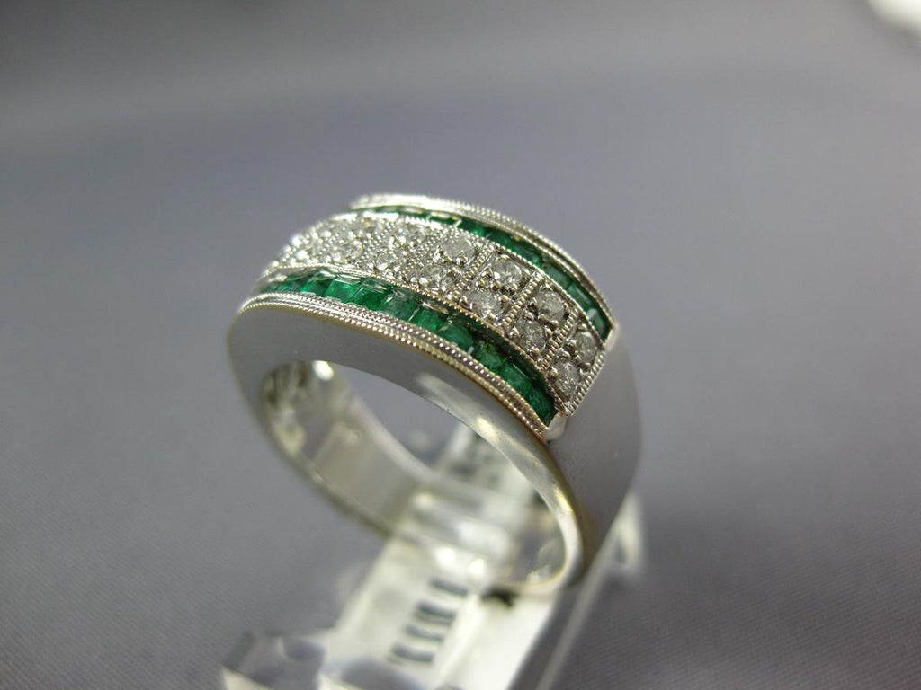 18KT WHITE GOLD ANNIVERSARY RING. 3D MULTI ROW FILIGREE MILGRAIN DESIGN. ROUND DIAMONDS ARE F/G COLOR, VSSI CLARITY .27 CARATS. AAA PRINCESS CUT EMERALDS ARE .68 CARATS. MEASURES 9mm WIDE. RING SIZE 7. CAN BE SIZED BY OUR MASTER JEWELER UPON REQUEST. WRITTEN APPRAISAL AVAILABLE. COMES IN A PRESENTABLE GIFT BOX.