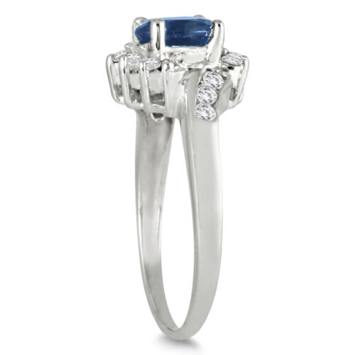 14KT WHITE GOLD ENGAGEMENT RING. 3D CRISS CROSS FLOWER DESIGN. ROUND DIAMONDS ARE F/G COLOR, VSSI CLARITY .26 CARATS. AAA OVAL SAPPHIRE IS .69 CARATS. RING SIZE 7. CAN BE SIZED BY OUR MASTER JEWELER UPON REQUEST. WRITTEN APPRAISAL AVAILABLE. COMES IN A PRESENTABLE GIFT BOX.