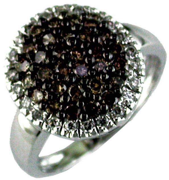 14KT WHITE GOLD FUN RING. 3D CLUSTER ROUND DESIGN. WHITE DIAMONDS ARE F/G COLOR, VSSI CLARITY .20 CARATS. CHOCOLATE FANCY DIAMONDS ARE .75 CARATS. RING SIZE 7. CAN BE SIZED BY OUR MASTER JEWELER UPON REQUEST. WRITTEN APPRAISAL AVAILABLE. COMES IN A PRESENTABLE GIFT BOX.