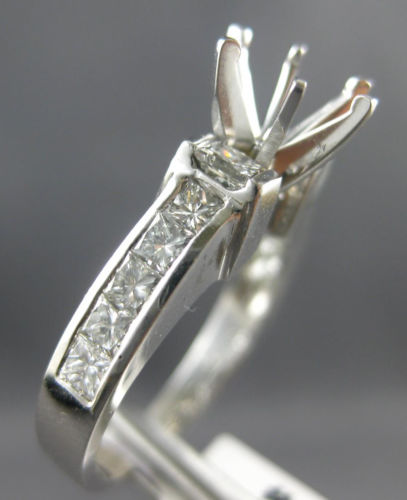 14KT WHITE GOLD SEMI MOUNT ENGAGEMENT RING. 3D SIX PRONG CHANNEL DESIGN. ROUND AND PRINCESS DIAMONDS ARE F/G COLOR, VVS CLARITY .96 CARATS. MEASURES 4mm WIDE. RING SIZE 5.25. SEMI MOUNT FITS UP TO 2MM ROUND STONE. CAN BE SIZED BY OUR MASTER JEWELER UPON REQUEST. WRITTEN APPRAISAL AVAILABLE. COMES IN A PRESENTABLE GIFT BOX.