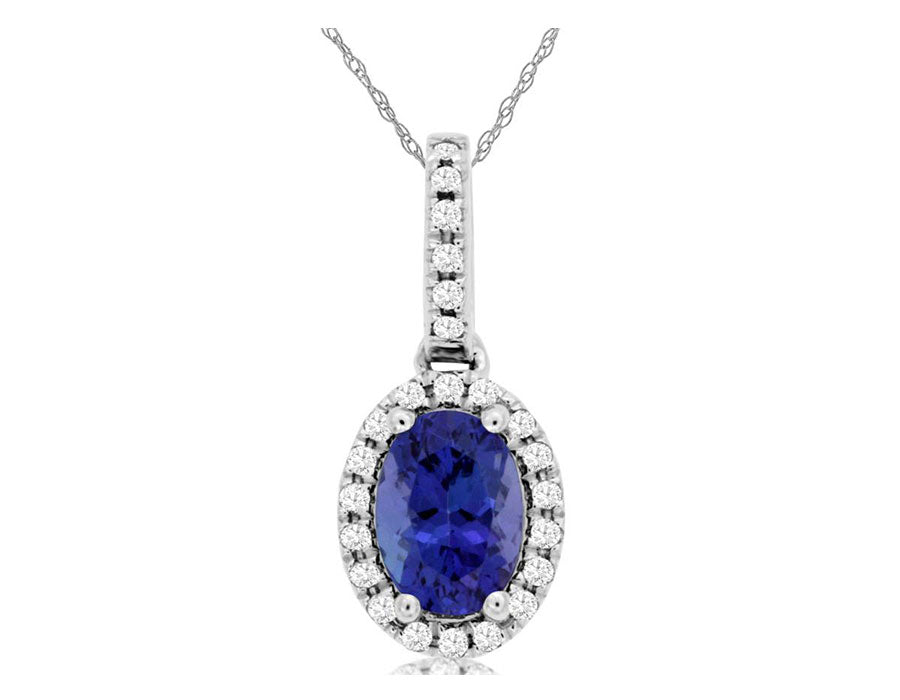 14KT WHITE GOLD FLOATING PENDANT. 3D CLASSIC HALO DESIGN. ROUND DIAMONDS ARE F/G COLOR, VSSI CLARITY .12 CARATS. AAA EXTRA FACETED OVAL TANZANITE IS .84 CARATS. COMES ON A 14KT GOLD DIAMOND CUT 18" INCH CHAIN. WRITTEN APPRAISAL AVAILABLE. COMES IN A PRESENTABLE GIFT BOX.