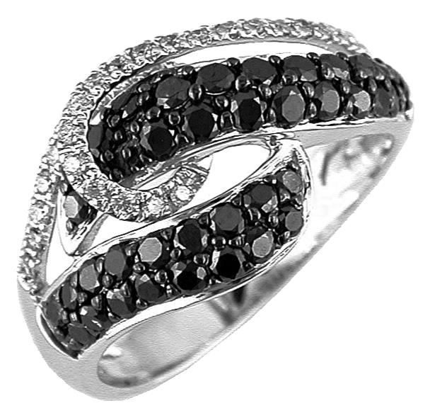 14KT WHITE GOLD FUN RING. 3D MULTI LEAF CRISS CROSS LOVE KNOT DESIGN. WHITE DIAMONDS ARE F/G COLOR, VSSI CLARITY .18 CARATS. BLACK DIAMONDS ARE .78 CARATS. RING SIZE 7. CAN BE SIZED BY OUR MASTER JEWELER UPON REQUEST. WRITTEN APPRAISAL AVAILABLE. COMES IN A PRESENTABLE GIFT BOX.